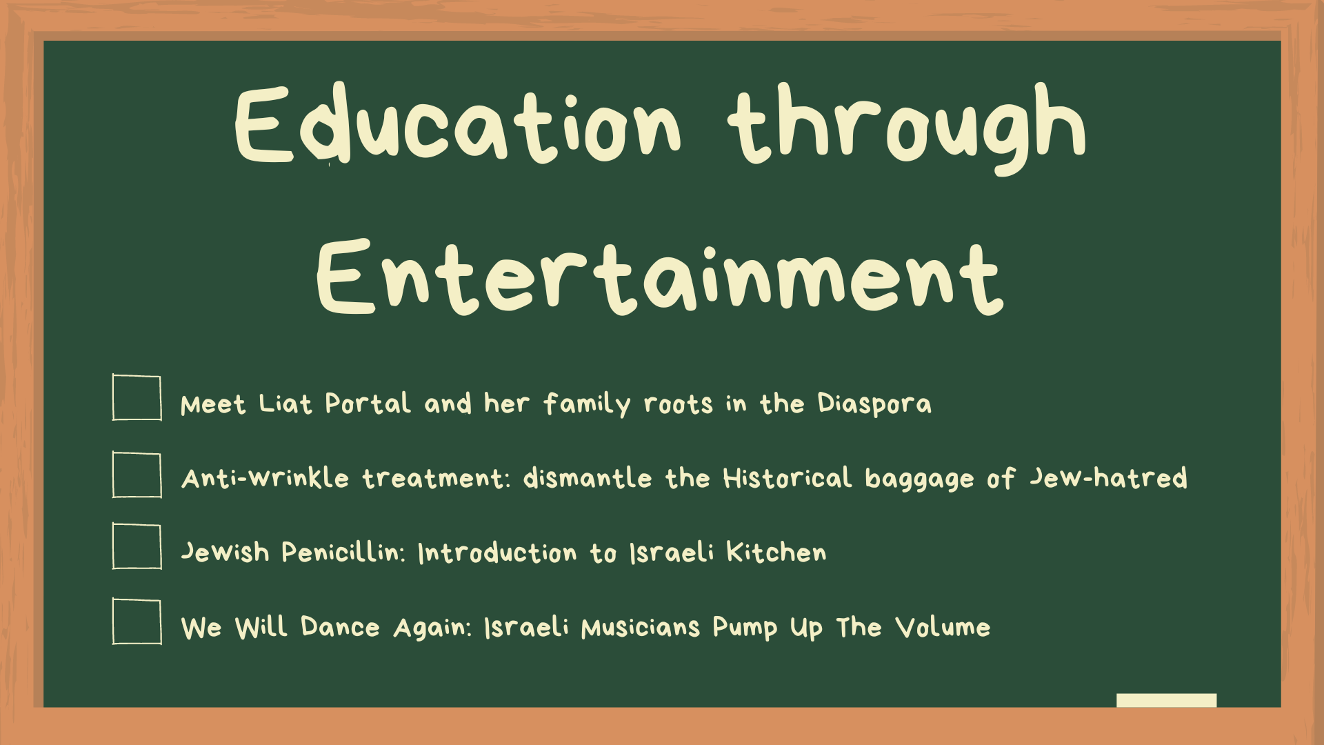 In this class, I’ll share my family stories and my memories since childhood. I’ll tell you how music saved my life and can foster global peace. I’ll introduce you to Israeli music culture and how it bonds, inspires, and helps us heal from the atrocities we have been through for generations. I’ll show you how the melting pot of Jewish communities from around the world created rich Israeli cuisine, which stands out uniquely because of the blend of flavors from various countries in the diaspora. I’ll give you tips on the best tourist sites to visit and which events you shouldn’t miss. I’ll share with you how it is to live in Israel, the impossible reality of daily terror attacks, and the stress levels we need to deal with. I’ll share with you the success stories of entrepreneurs who did the impossible and built successful global companies against all odds. I’ll show you how we make the impossible possible every day.