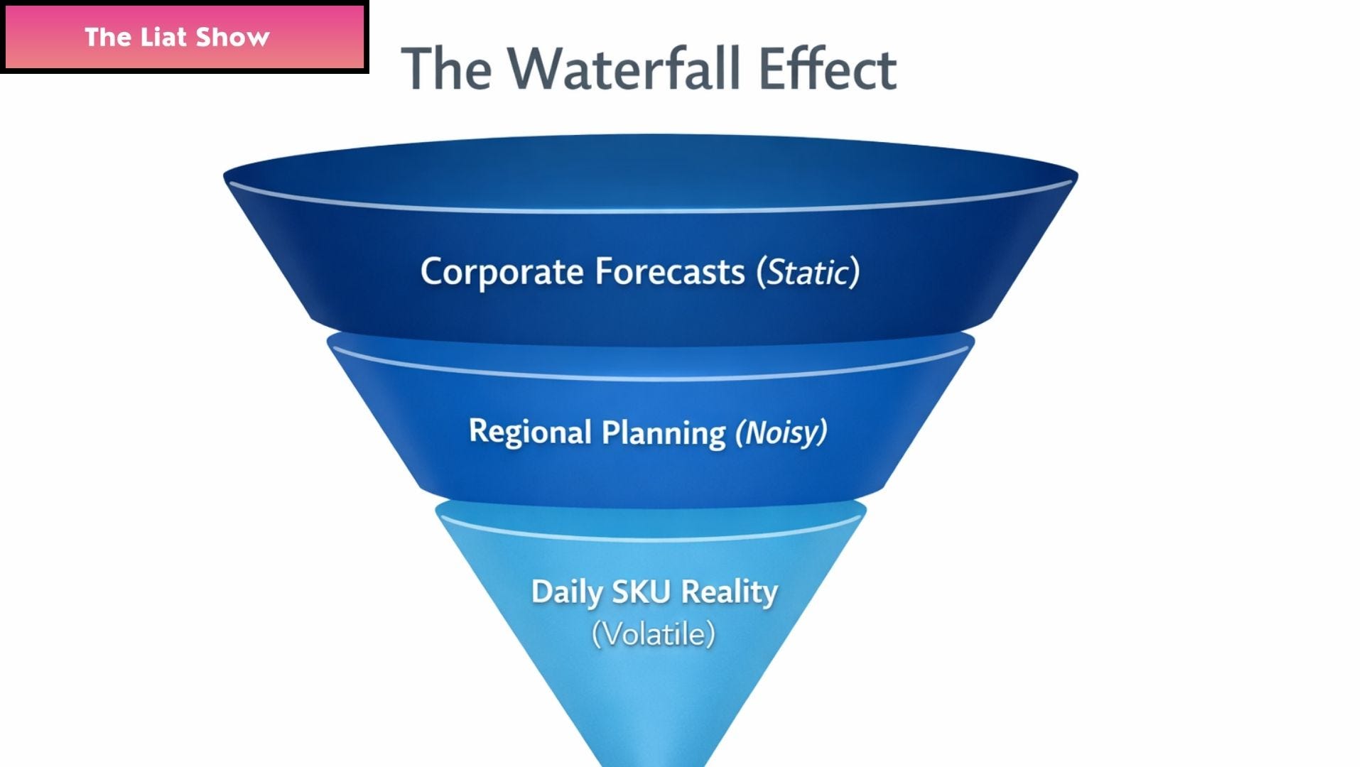 The Waterfall Effect describes how planning abstractions collapse as decisions move from corporate forecasts to regional plans and finally to daily SKU reality, where volatility is highest and time to act is shortest.